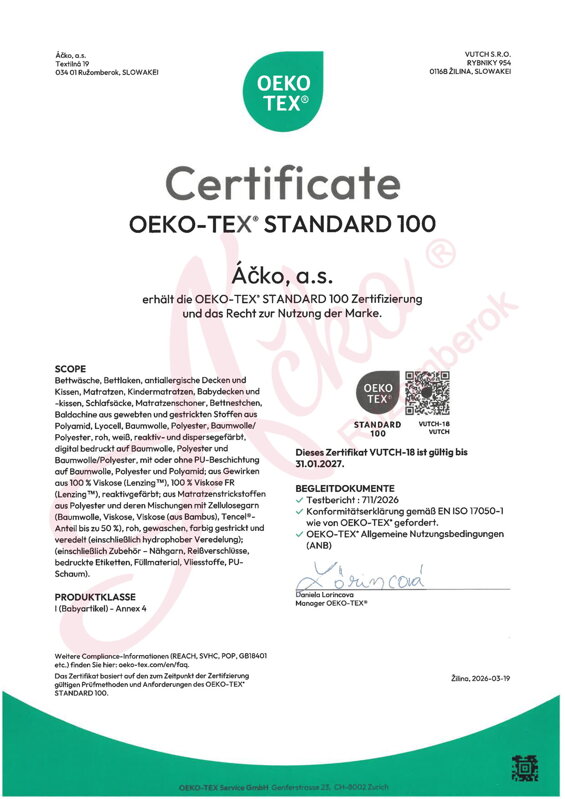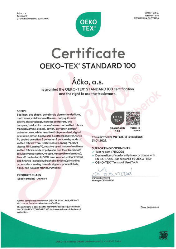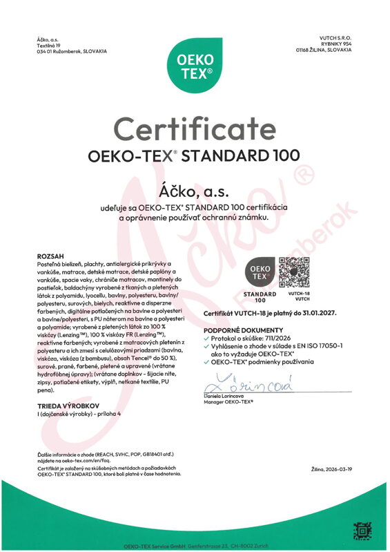 Naše výrobky sú označené symbolom „Textílie hodné dôvery OEKO-TEX® Standard 100."