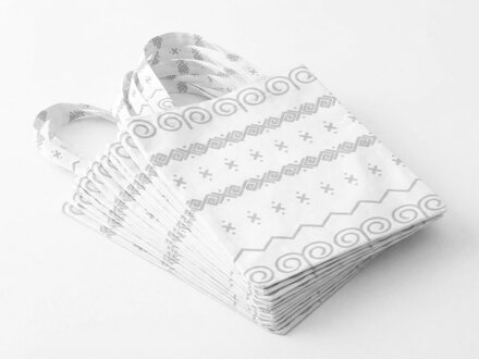 Praktické balenie 100 kusov obojstranných textilných tašiek v krásnom tradičnom čičmanskom prevedení. Každá taška je zdobená nápaditým sivým vzorom na bielom podklade a spája moderný minimalizmus s ľudovou tradíciou.